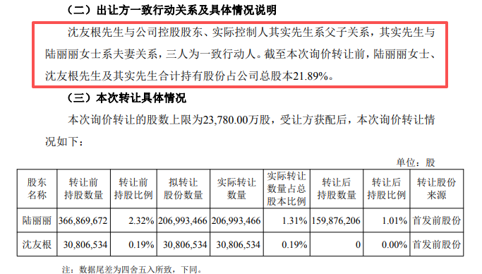 陆丽丽和沈友根并不是东方财富的“普通”股东,沈友根与公司控股股东、实际控制人其实系父子关系,其实与陆丽丽系夫妻关系,三人为一致行动人。本次询价转让前,陆丽丽、沈友根及其实合计持有股份占公司总股本21.89%。此次权益变动后,三人合计持股比例下降至20.39%。
