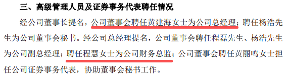 另外,经公司董事长提名,公司董事会聘任黄建海为公司总经理,聘任程慧为公司财务总监。