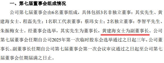 公告显示,经董事会选举,公司副总经理、财务总监、董事会秘书黄建海上任副董事长,任期为三年。(注:此前,持股市值超千万的黄建海计划减持股票变现。详见《围观!年薪超300万、身价上千万的A股公司CFO计划减持变现!》)