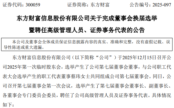 2025年12月15日晚间,深交所创业板上市公司东方财富(300059.SZ)发布了完成换届选举暨聘任高管的公告,新一届高管名单正式出炉!