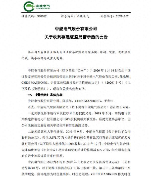 1月16日,中能电气(证券代码:300062)公告,公司于2026年1月16日收到福建证监局出具的警示函,指出公司存在两项违规行为:一是2018年6月收购福建祥瑞电力工程有限公司100%股权时未履行关联交易的审议程序和信息披露义务;二是2019年9月披露转让大连瑞优能源发展有限公司100%股权后,同年12月签订补充协议调减转让价格605万元,但未披露该重大事件进展。上述行为违反了《上市公司信息披露管理办法》相关规定。