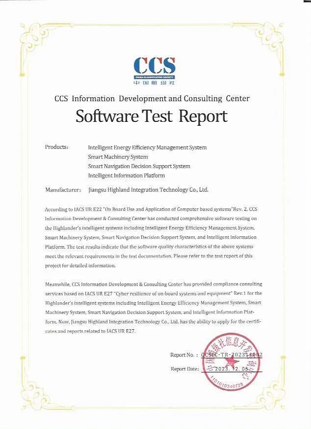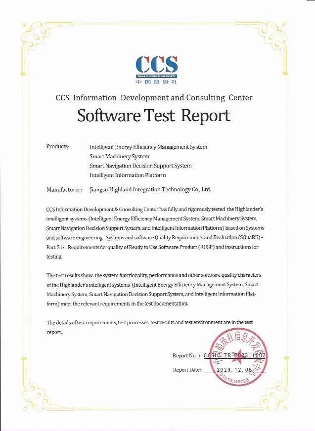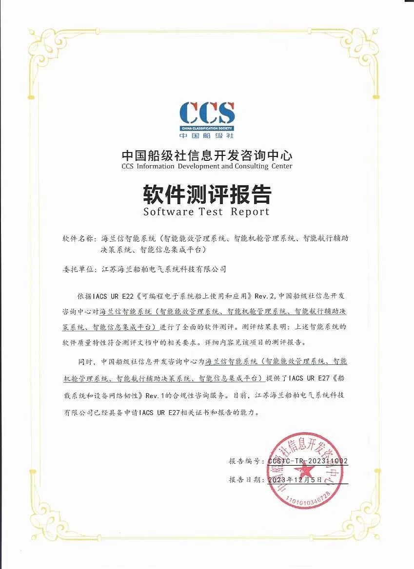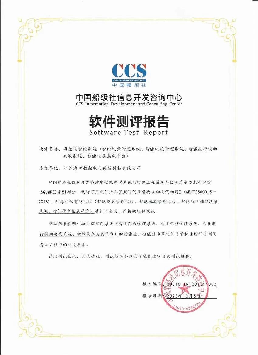 随后,中国CCS船级社向海兰信颁发了关于智能船方面的重要证书,中国船级社信息开发咨询中心对海兰信智能系统(智能能效管理系统、智能机舱管理系统、智能航行辅助决策系统、智能信息集成平台)进行了全面的软件测评。测评结果表明:上述智能系统的软件质量特性符合测评文档中的相关要求。这是海兰信在智能船领域的又一项荣誉。智能船是航运业发展的未来趋势,具有重要的意义。这份证书的颁发是对海兰信不懈努力和持续创新能力的认可。我们期待,这一荣誉将成为双方深化合作的崭新起点,激励更多行业精英投身于智能船和高科技航海技术的发展之中,共同推动航运业向数字化、智能化迈进,提高航行安全性和效率。