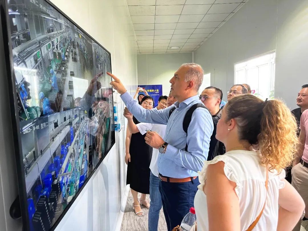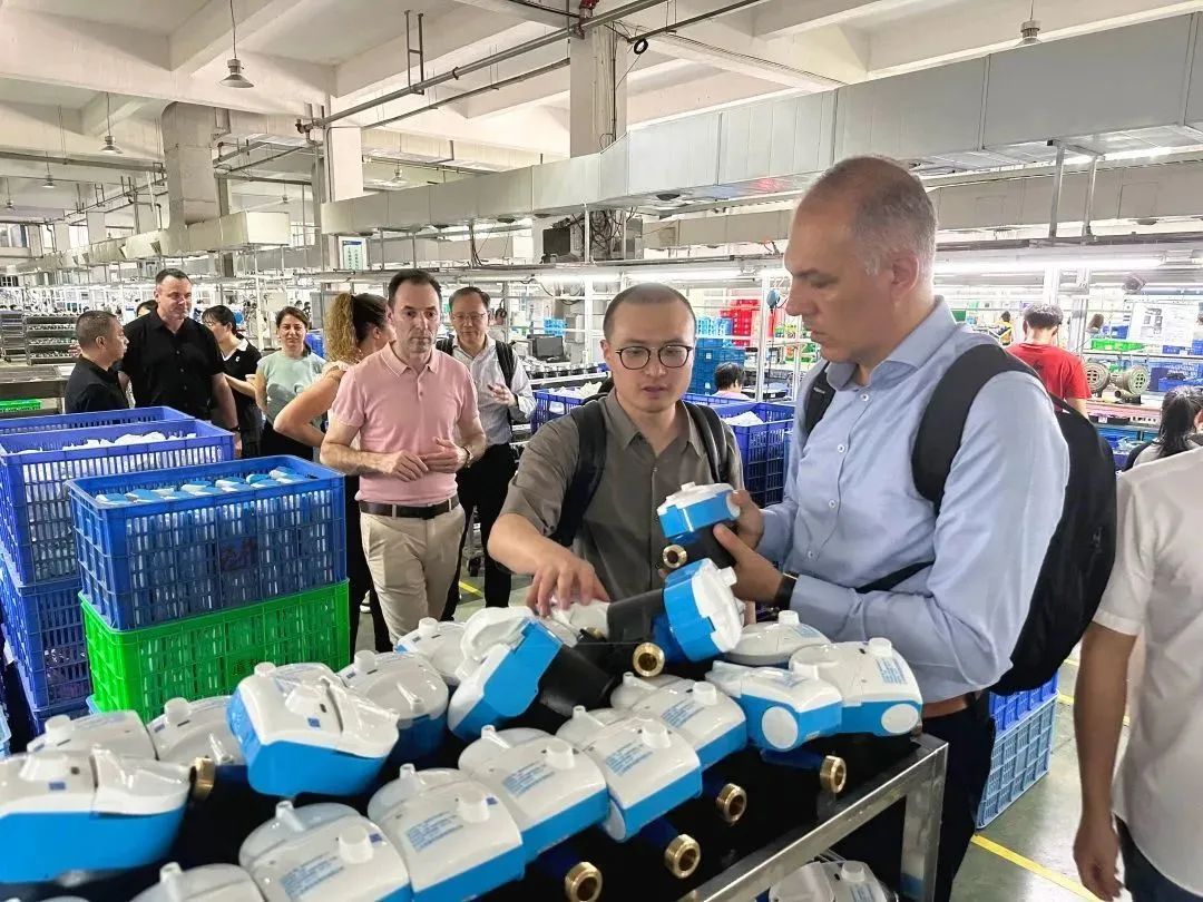 Hamed Heyhat总裁一行首先来到公司展厅,三川智慧总裁李强祖系统介绍了公司52年的发展历程、核心技术、智慧水务运维领域的工程实践及市场分布情况;在产品制造车间,Hamed Heyhat总裁一行认真听取了企业数字化产线建设、产品生产工艺改进和公司在“智慧水务的全链物联设备与系统”的科技成果转化等情况介绍。Hamed Heyhat总裁把各产品线的智能表具都举在手中细细端详,与车间负责人互动交流,热切探讨智能水表的发展前景。Hamed Heyhat总裁对三川智慧在表具领域较全的产品品类给予了高度赞许,对生产车间6s常态化管理制度给予了高度肯定,对公司在智能水表领域的显著成果给予了高度评价。