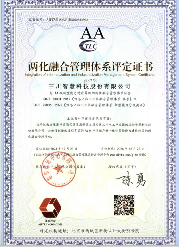 近日,三川智慧顺利通过工信部《信息化和工业化融合管理体系要求》及《信息化和工业化融合管理体系新型能力分级要求》体系认证审核,正式取得两化融合管理体系AA级评定证书,标志着公司在推进两化深度融合方面取得显著成效并获得国家认可。