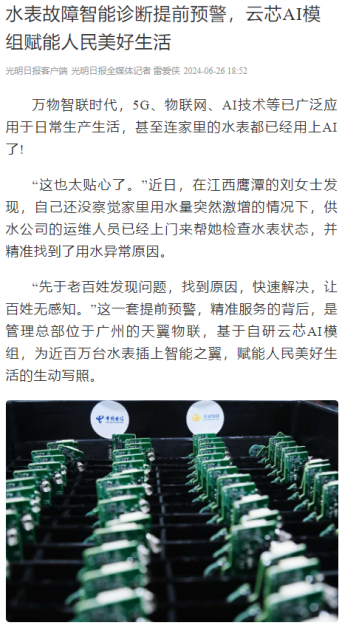 6月21日,三川智慧与天翼物联、中国电信合作,采用了自研的云芯AI模组,为近百万台水表插上了智能之翼。通过这一举措,三川智慧让水表实现“说话”:提前预警和智能错峰,大幅提升了售后运维效率,为用户提供了更加智能、便捷的用水体验。