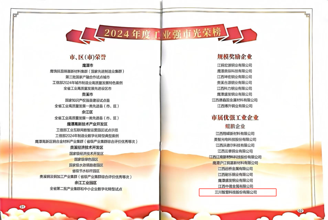 3月17日,鹰潭市人民政府召开“全市新型工业化暨国家级铜基新材料集群推进大会”,三川智慧凭借其在智能水表及铜基新材料领域的卓越贡献与创新实力,荣获“市属优强工业企业-鲲鹏企业”大奖。这一荣誉不仅是对企业深耕主业、勇攀高峰的肯定,更彰显了三川智慧推动鹰潭工业现代化进程中的标杆作用。