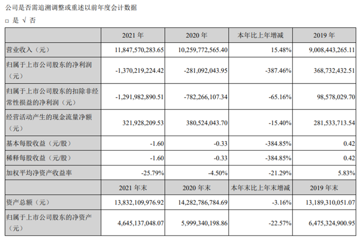 2021年,南都电源实现营业收入118.48亿元,同比增长15.48%;归属于上市公司股东的净利润-13.70亿元,同比下滑387.46%;归属于上市公司股东的扣除非经常性损益的净利润-12.92亿元,同比下滑65.16%;经营活动产生的现金流量净额为3.22亿元,同比下滑15.40%。
