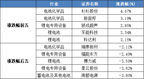 12月29日,电池行业下跌0.10%,沪深300下跌0.38%,电池行业跑赢大盘0.28pct。行业中涨跌幅前五的公司有杉杉股份(4.67%)、新宙邦(3.19%)、骄成超声(2.85%)、孚能科技(2.34%)和科利达(2.15%);涨跌幅后五的公司分别是瑞泰新材(-2.12%)、福能东方(-2.49%)、博力威(-3.59%)、星云股份(-3.62%)和南都电源(-3.80%)。