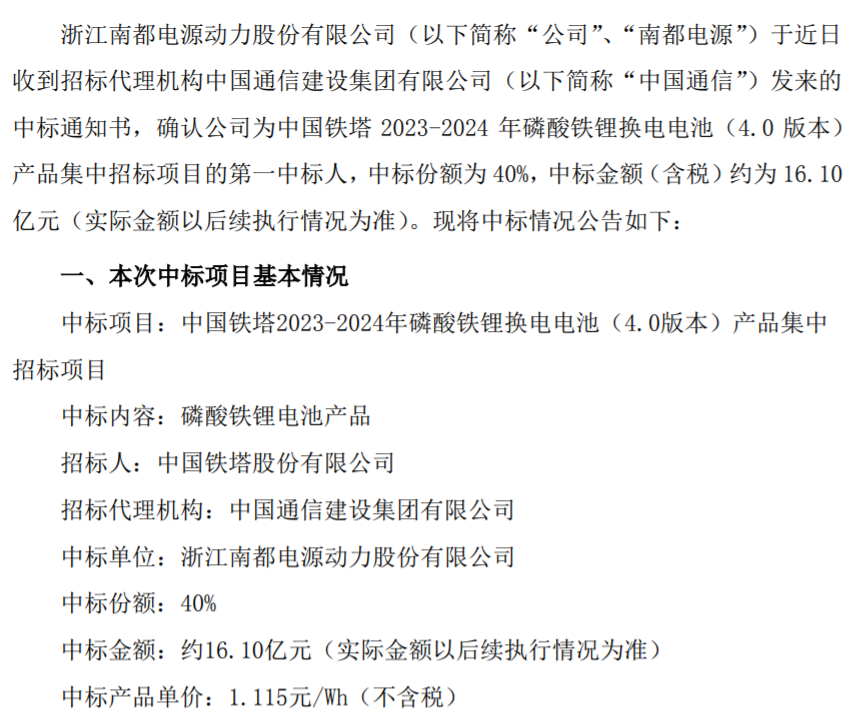 6月19日,南都电源发布公告,公司近日收到中标通知书,确认公司为中国铁塔2023-2024年磷酸铁锂换电电池(4.0版本)产品集中招标项目的第一中标人,中标份额40%,中标金额约16.1亿元(含税),占2022年公司营业收入的13.7%。