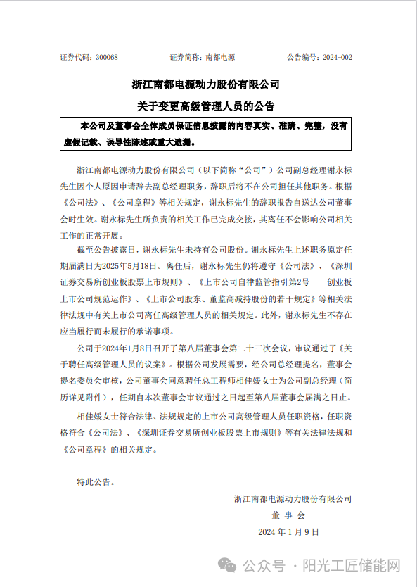 1月9日,南都电源发布公告称,副总经理谢永标因个人原因申请辞去副总经理职务。辞职后将不在公司担任其他职务。经公司总经理提名,董事会提名委员会审核,公司董事会同意聘任总工程师相佳媛为公司副总经理。