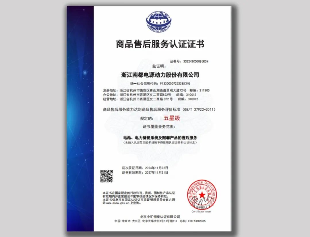 日前,南都电源凭借完善的售后服务体系、优秀的服务质量,经过严格评审与考核,顺利通过国家标准的GB/T 27922-2011《商品售后服务评价体系》认证评价,荣获五星级认证证书。