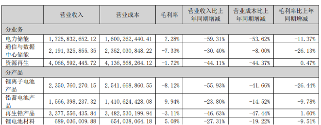 数据显示,2024年,锂离子电池产能利用率仅49.38%,其销量更是同比下滑38.78%至2.81GWh。反应到业绩层面,锂离子电池产品营收同比下滑55.93%至23.51亿元,营收占比29.44%,是继再生铅产品后第二大收入来源。但其毛利率仅-8.12%,同比下滑了26.44个百分点,也出现了ldquo;赔本赚吆喝rdquo;的情况。
