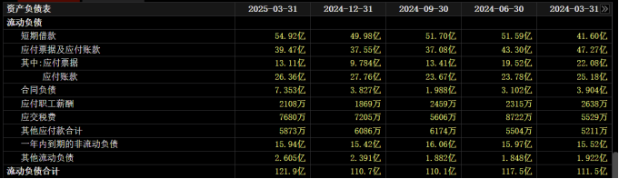 从债务结构来看,南都电源2025年一季度流动负债合计121.86亿元,其中短期借款及一年内到期的非流动负债合计70.86亿元,占流动负债的比重为58.15%,而同期账面货币资金仅25.39亿元。