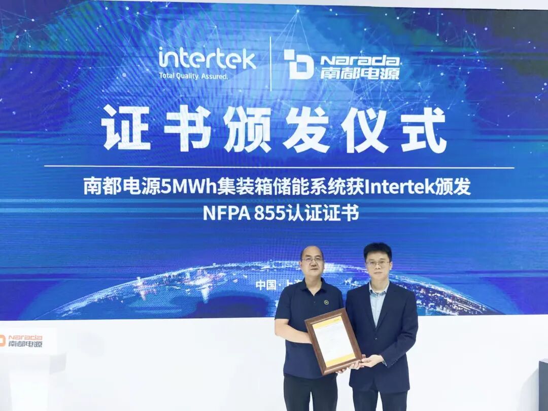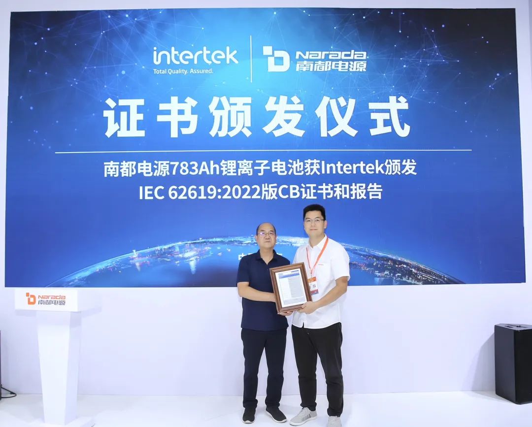 在展台发布区,国际权威检测机构Intertek天祥集团为南都电源自主研发的5MWh集装箱储能系统颁发NFPA 855认证证书,同时为783Ah超大容量储能电池颁发IEC 62619:2022版CB证书及报告。
