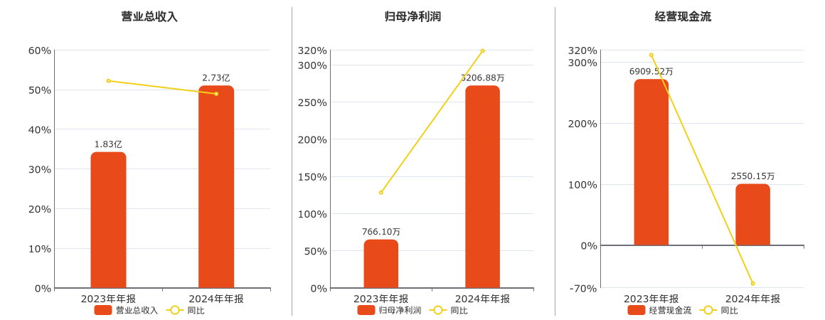 公司营业总收入为2.73亿元,在已披露的同业公司中排名第76。归母净利润为3206.88万元,在已披露的同业公司中排名第64。经营活动现金净流入为2550.15万元,在已披露的同业公司中排名第62,较去年同报告期经营活动现金净流入减少4359.36万元,同比较去年同期下降63.09%。