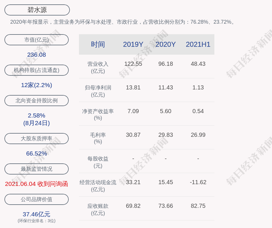 每经AI快讯,碧水源(SZ 300070,收盘价:7.46元)8月25日晚间发布半年度业绩报告称,2021年上半年营业收入约48.43亿元,同比增加48.83%;归属于上市公司股东的净利润盈利约1.13亿元,同比增加71.58%;基本每股收益盈利0.0356元,同比增加71.15%。分配方案为:不分红、不送红股、不转增。