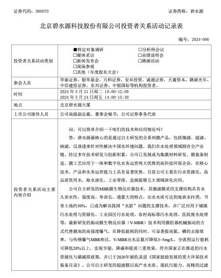 答:碧水源最核心的是通过自主研发的全系列膜产品,包括微滤、超滤、纳滤、反渗透来针对性解决中国水环境问题,我们在水处理领域拥有全产业链。经过多年技术研发与创新积累,公司已发展成为集膜材料研发、膜装备制造、膜工艺应用于一体和数字化水务运营两大优势的高科技环保企业,在核心技术、产品和水务运营能力上具有显著优势。目前公司主要在污水资源化、高品质饮用水、海水淡化、工业零排、盐湖提锂五大领域深化应用。