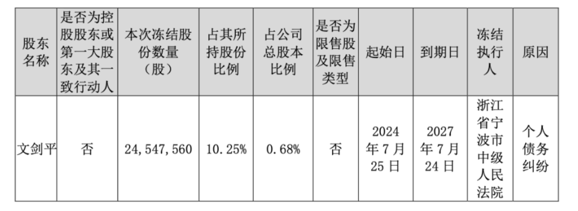 公告显示,截至 2023年7 月 11 日,文剑平所持股份已有超过一半被司法冻结。