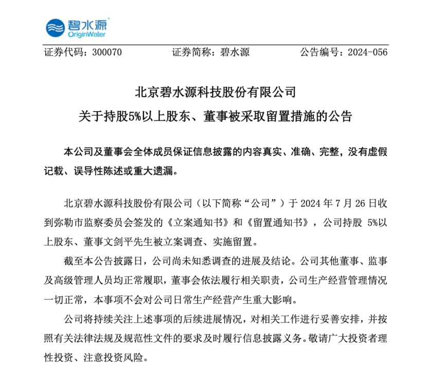 7月26日晚间,碧水源发布公告称,公司于当日收到弥勒市监察委员会签发的《立案通知书》和《留置通知书》,公司持股 5%以上股东、董事文剑平先生被立案调查、实施留置。