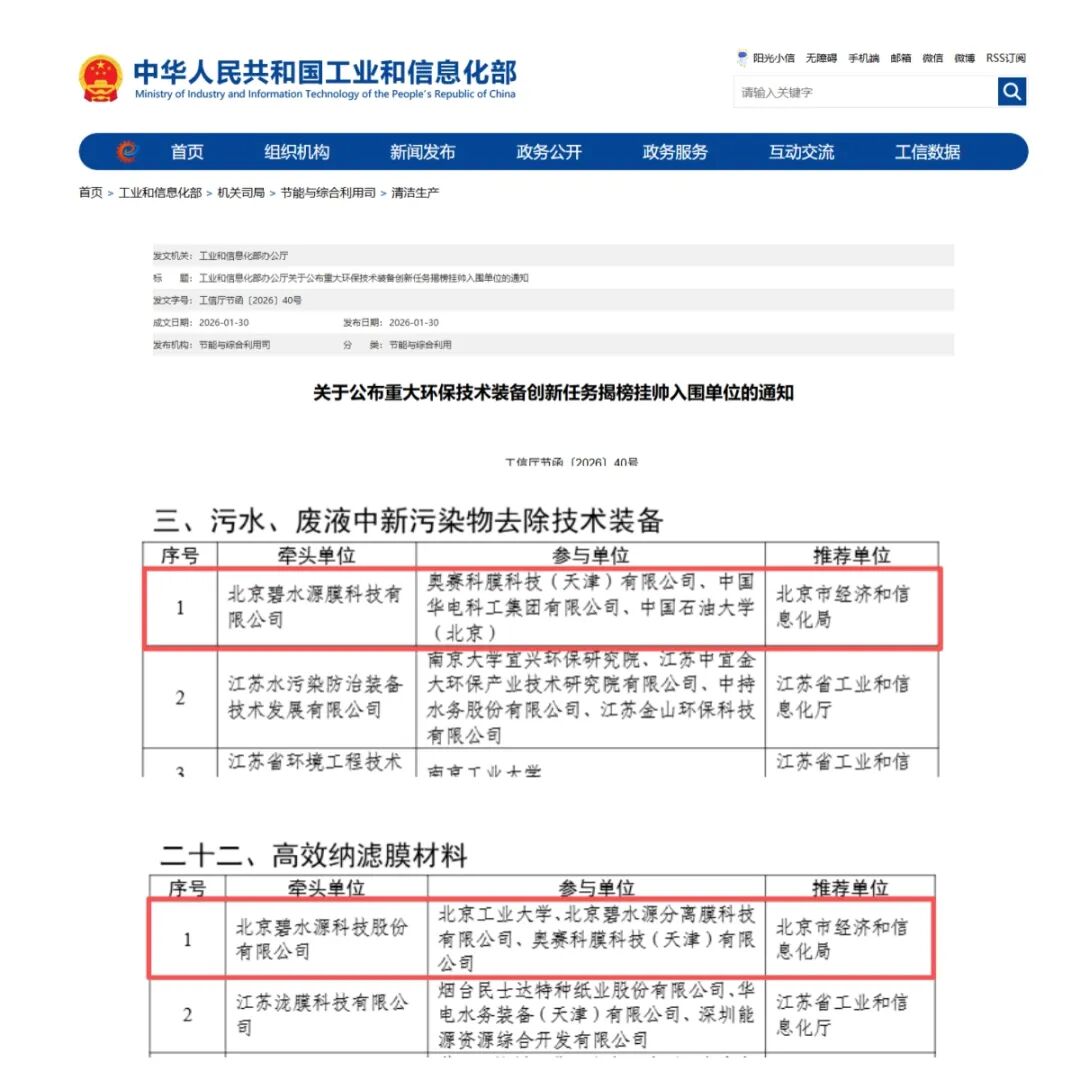 近日,工业和信息化部官网正式公布2025年重大环保技术装备创新任务揭榜挂帅入围单位名单,碧水源凭借硬核创新实力,牵头攻关的“高效纳滤膜材料”与“污水、废液中新污染物去除技术装备”任务成功入选。此次入选不仅标志着碧水源在膜材料研发与前沿水处理技术领域的实力获得国家权威认可,更彰显其在突破环保装备行业“卡脖子”技术难题中的领军地位。