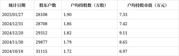 从2月5日公开信息显示,华平股份截至2025年1月27日公司股东户数为2.81万户,较上期(2024年12月31日)减少600户,降幅为2.09%,变化不大。