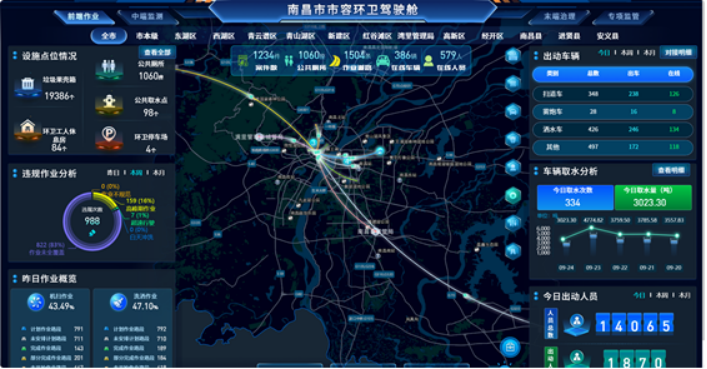 市容环卫专项。接入环卫车辆1800余辆,环卫人员13000余名,环卫基础设施21000余个,对接末端地磅、炉温监测、环保指标监测等数据,实现对环卫相关人、车、物的精细化监管。另外,开展机械化作业管理,平台自动生成每日1500条道路的洗洒作业和机扫作业的完成情况专题图。结合南昌精细化考核办法,平台可对主次干道、背靠小巷、公厕、垃圾转运站、垃圾转运车五类考核对象下发考核任务,涉及考核点位200余个,相关结果纳入区县考核。为深化马路本色行动,固化洗城结果,创新开发洗城行动板块,每周可督促各区县下发洗城计划,上传洗城结果,生成洗城记录,环卫保洁管理水平和人居环境专项攻坚均取得显著成效。