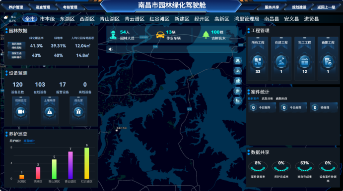 园林绿化专项。平台通过录入市区绿道、公园、行道树等基础数据,打造园林绿化一张图,展示实际分布情况,分析计算各区县三率指标,结合已有规划,推动园林绿化工程建设;对目前存活的古树名木实行一树一码管理模式,确定其管养单位及责任人,定时巡查,加大古树名木保护力度;同时,建立病虫害防治知识库,接入前端病虫害、土壤墒情设备监测数据,对园林养护提供病虫害防治建议;系统可灵活制定对应时节的养护计划与流程,便于管理人员针对不同的植被、花草进行分类养护,实现园林绿化的科学管养。