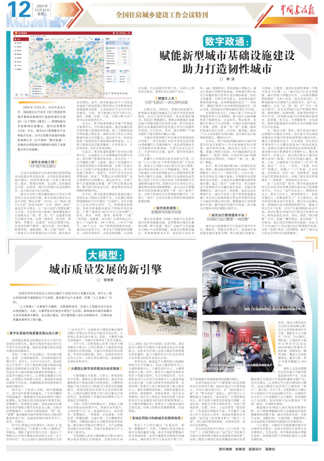 12月24日,全国住房和城乡建设工作会议期间,中国建设报发布特刊文章:《数字政通:赋能新型城市基础设施建设助力打造韧性城市》,介绍了开封、北京、武汉等地的城市生命线安全工程优秀案例,青岛、杭州等地的城市运管服平台建设优秀案例,为全国城市智慧化、精细化管理提供参考。