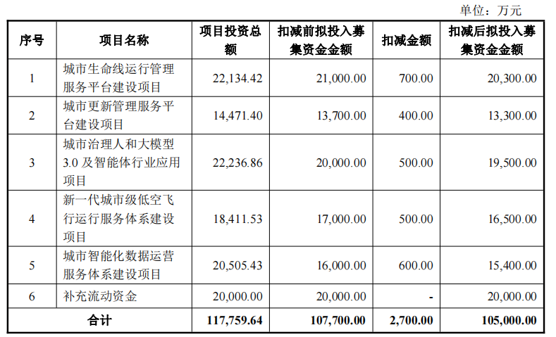 中国经济网北京10月16日讯数字政通(300075.SZ)昨晚披露2025年度向特定对象发行A股股票预案称,本次向特定对象发行股票拟募集资金总额不超过105,000.00万元(含本数)。根据相关规则,截至预案公告日,公司前次募集资金中补充流动资金金额超出前次募集资金总额的30%,公司将超出部分于本次募集资金的总额中调减。调整前后具体投入情况如下:城市生命线运行管理服务平台建设项目、城市更新管理服务平台建设项目、城市治理人和大模型3.0及智能体行业应用项目、新一代城市级低空飞行运行服务体系建设项目、城市智能化数据运营服务体系建设项目、补充流动资金。
