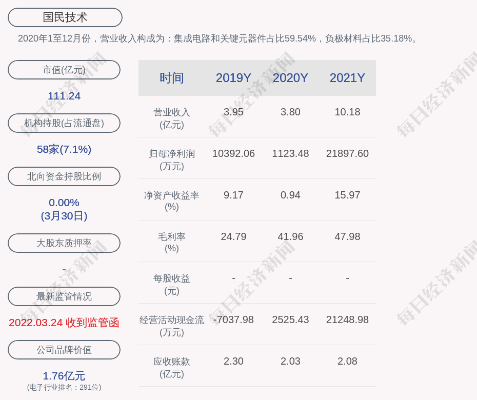 2020年1至12月份,国民技术的营业收入构成为:集成电路和关键元器件占比59.54%,负极材料占比35.18%。