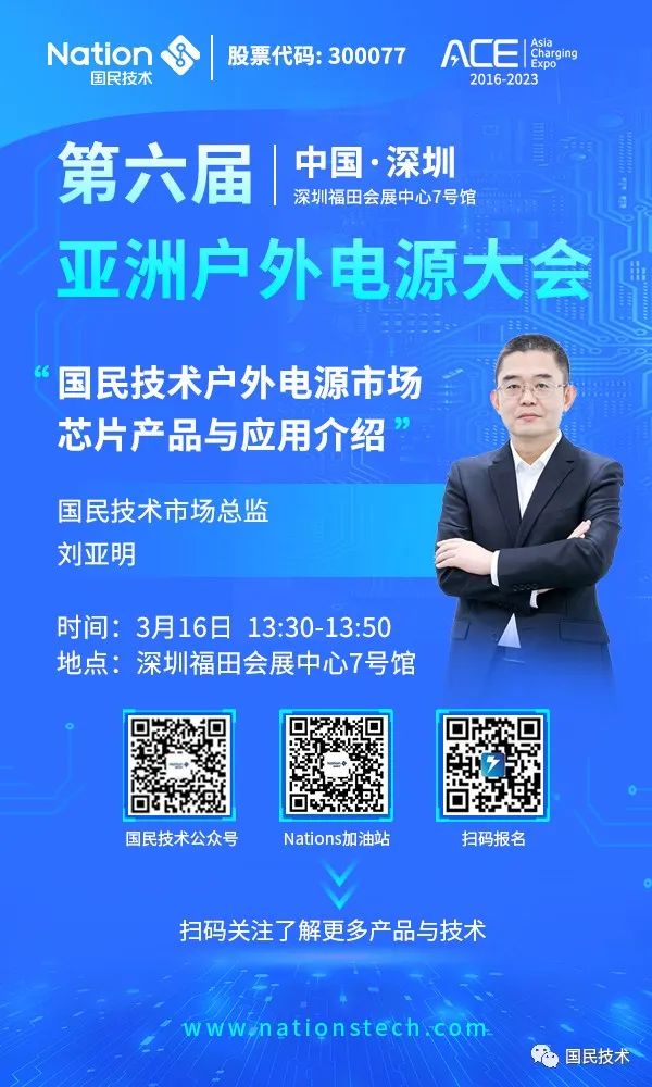 3月16日第六届亚洲户外电源大会上国民技术市场总监刘亚明将会解读国民技术在新能源领域的产品布局,分享在户外电源、光伏系统、短交通电池BMS、汽车直流充电桩等新能源应用市场的成功案例。
