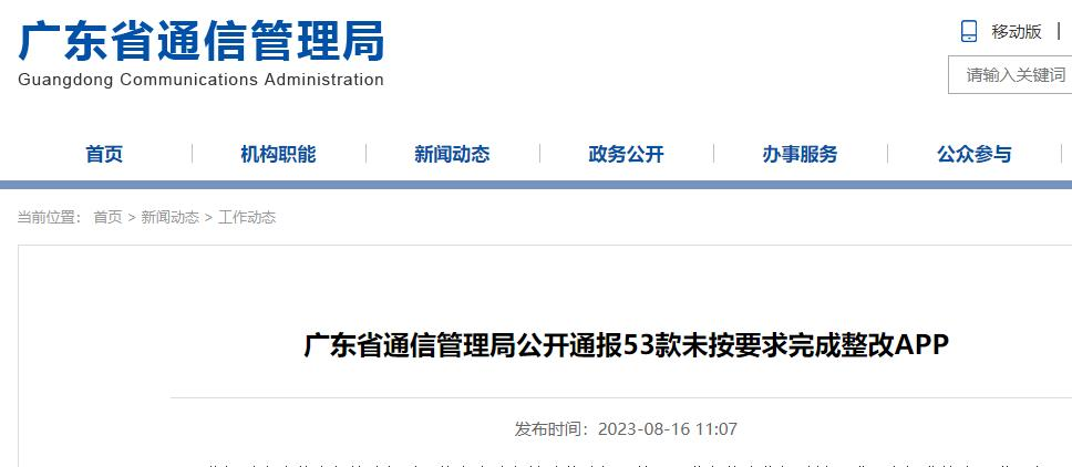 广东省通信管理局网站日前公布《广东省通信管理局公开通报53款未按要求完成整改APP》,依据《个人信息保护法》《网络安全法》等法律法规,按照工业和信息化部《关于进一步提升移动互联网应用服务能力的通知》(工信部信管函〔2023〕26号)等工作部署,广东省通信管理局持续开展APP隐私合规和数据安全专项整治行动,近期共监测发现278款APP存在侵害用户权益和安全隐患问题,发出《违法违规APP处置通知》责令APP运营者限期整改,并通知相关应用商店协助督促APP运营者整改。截至目前,尚有53款APP未完成整改,现予以通报。被通报的APP应在8月23日前完成整改及反馈工作。逾期不整改的,广东省通信管理局将依法依规采取下一步处置措施,切实维护APP用户合法权益和网络安全秩序。