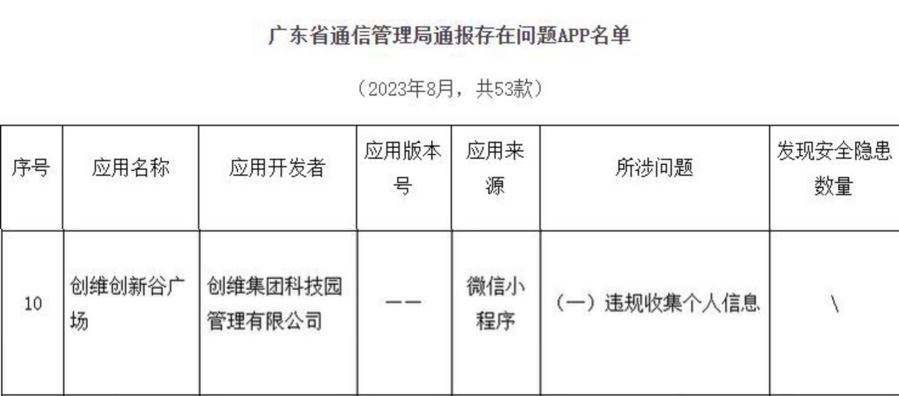 本次通报的53款存在问题APP名单中,由创维集团科技园管理有限公司开发的创维创新谷广场存在违规收集个人信息的问题,应用来源微信小程序。