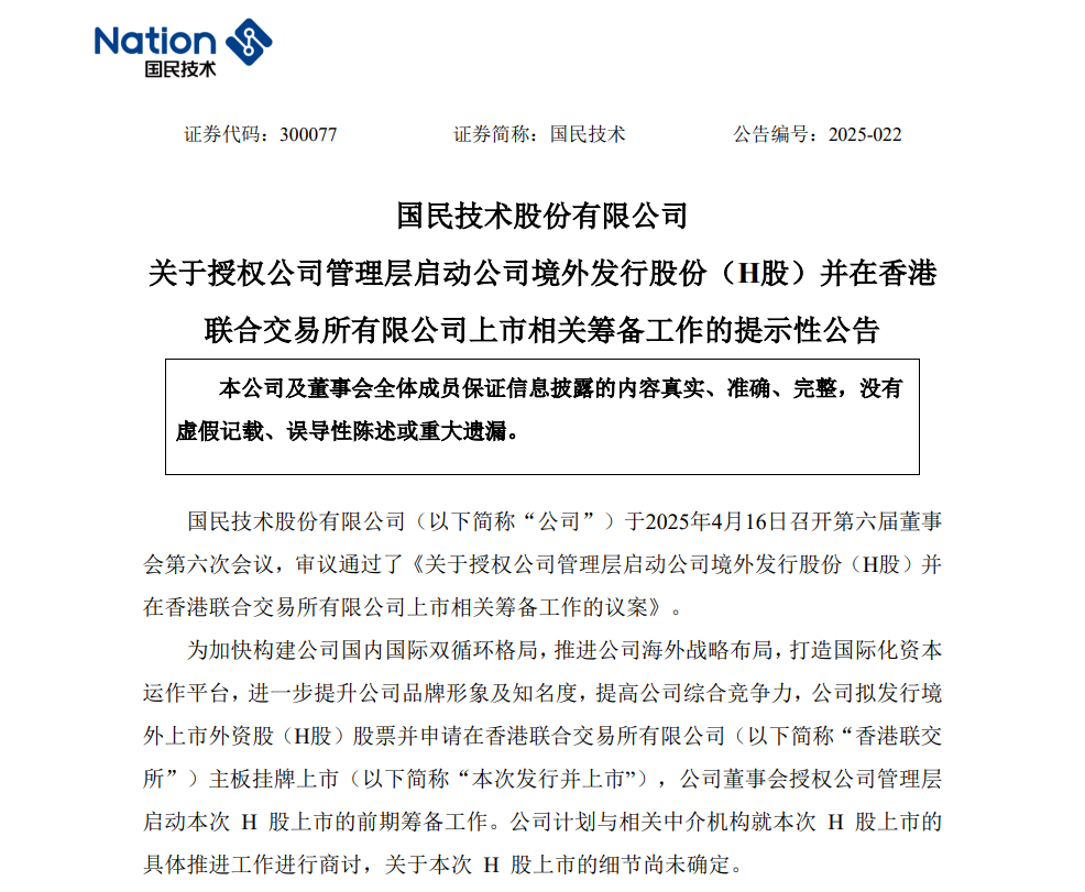 国民技术(300077.SZ)发布公告称,公司于2025年4月16日召开第六届董事会第六次会议,审议通过了《关于授权公司管理层启动公司境外发行股份(H股)并在香港联合交易所有限公司上市相关筹备工作的议案》。