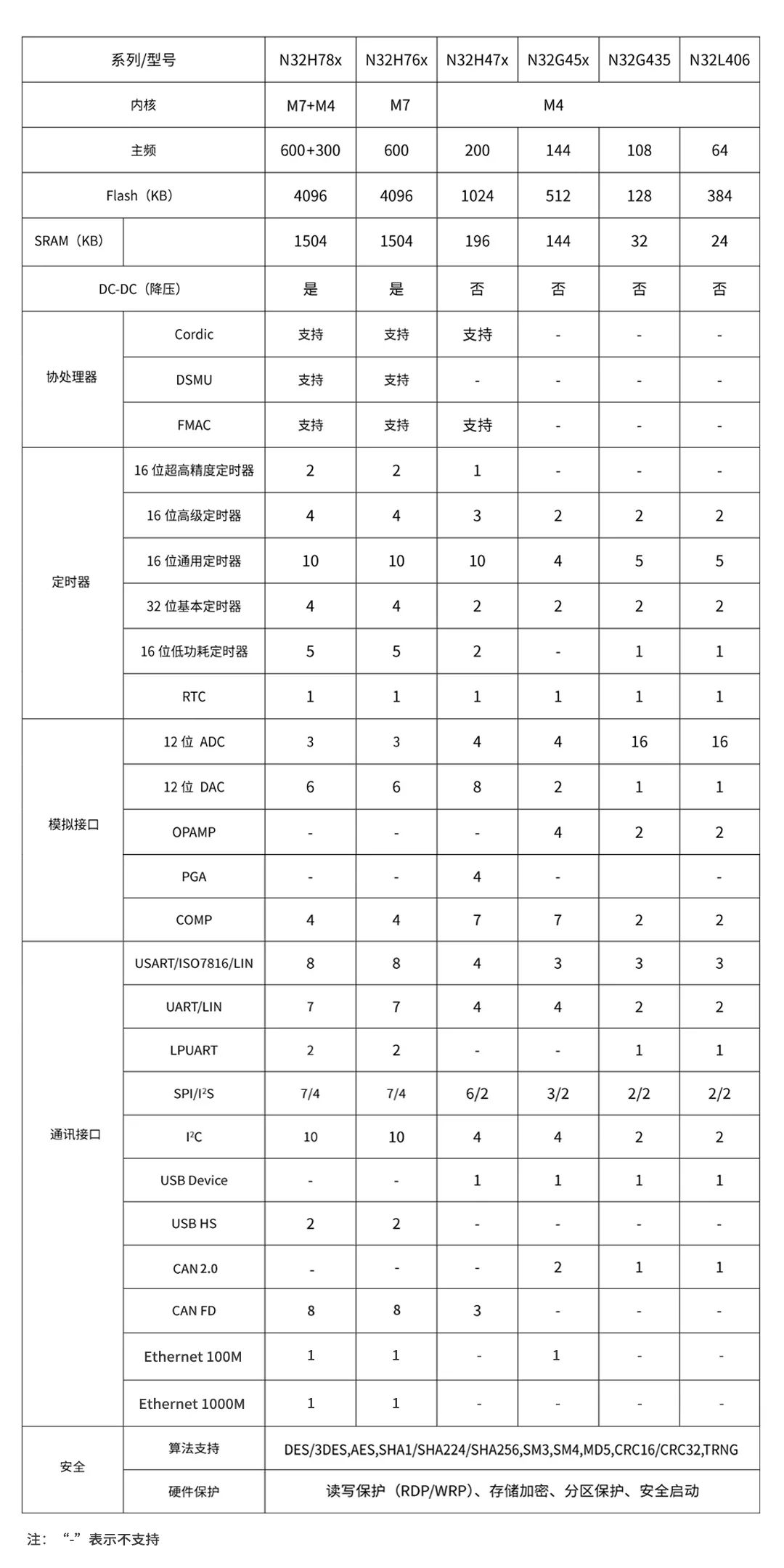 —高安全:支持外部高速、低速时钟失效检测和防拆检测等硬件防护机制,支持安全启动,支持多种硬件加密算法。