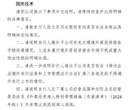 近日,国民技术收到证监会关于本次境外上市的备案反馈意见,具体反馈如下,请公司就以下事项补充说明,请律师核查并出具明确的法律意见: