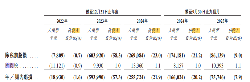 招股书显示,2022年至2024年,该公司的年内亏损分别为0.19亿元、5.94亿元和2.56亿元,连续三年亏损,2025年该公司前三季度净利润为亏损0.76亿元。