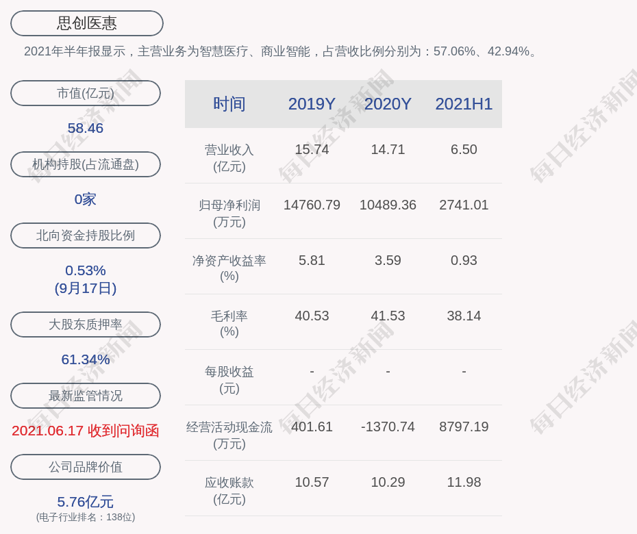 2021年半年报显示,思创医惠的主营业务为智慧医疗、商业智能,占营收比例分别为:57.06%、42.94%。