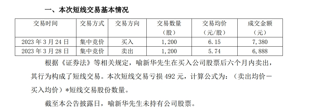 具体来看,喻新华于3月24日以均价6.15元/股买入1200股股票,3月28日以均价5.74元/股卖出1200股股票,短线交易亏损492元。