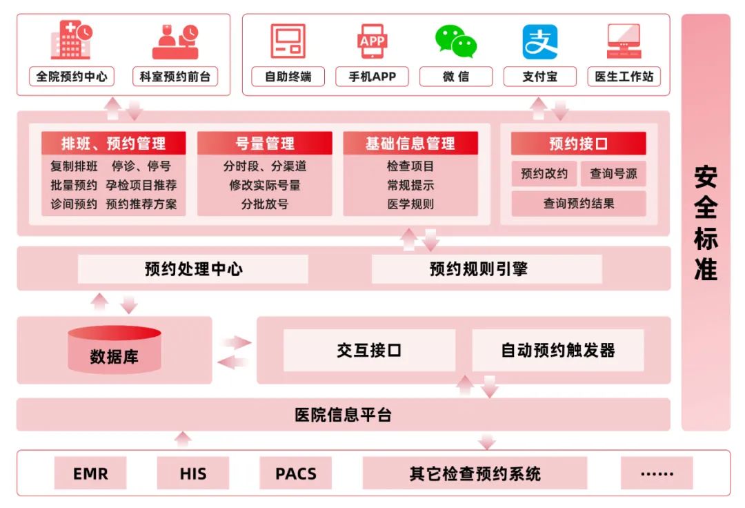 就医各环节等候时间是影响患者就医满意度的重要因素之一,预约诊疗是改善医疗服务的有效措施,传统预约模式已很难满足诊疗管理和发展需求,同时各渠道预约平台越来越多,缺乏统一资源管理,医院内外部均需设置大量应对管理机制及进行较多接口准备,重复资源投入且难以实现患者满意的应用效果。医惠科技以“预约资源统一化、管理资源科学化、资源接口开放化”为建设目标,基于微服务的智能统一预约平台,整合患者就诊过程中的医疗资源,构建门诊预约、医技预约、住院预约等业务应用,建设诊间、自助机、移动端等多个预约渠道的统一号源池,在此基础上实现排班管理、预约管理、预约规则管理等应用,实现人员与资源的合理分配,一方面合理安排患者就诊时间,缩短就诊排队时长,改善就诊体验;另一方面,减少医疗资源闲置时间,提高资源运作效率,使医疗资源的使用和服务更加合理与均衡。