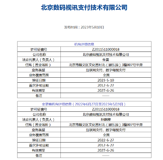 金融一线5月15日消息,据央行官网显示,北京数码视讯支付技术有限公司法定代表人发生变更,由孙鹏程调整为朱雷。