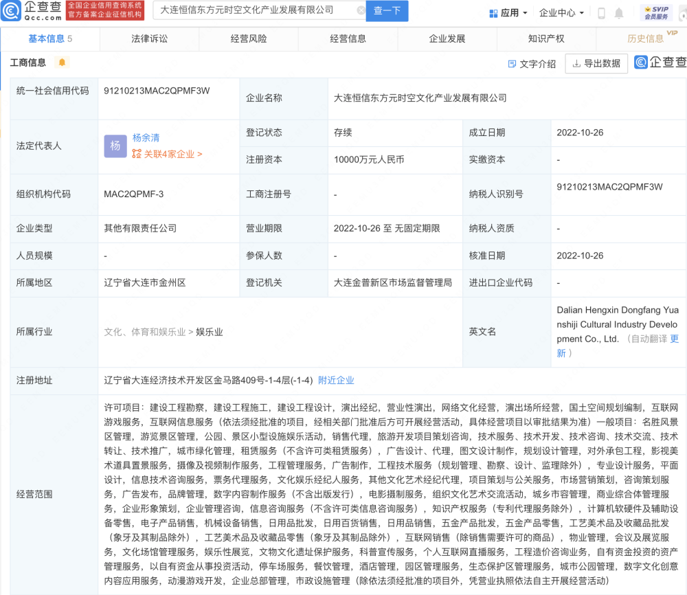 信息显示,近日,大连恒信东方元时空文化产业发展有限公司成立,法定代表人为杨余清,注册资本1亿元人民币,经营范围包含:演出经纪,营业性演出,文化娱乐经纪人服务,数字文化创意内容应用服务,动漫游戏开发等。股权穿透显示,该公司由大连恒信东方文旅产业发展有限公司、恒信东方(300081)共同持股。