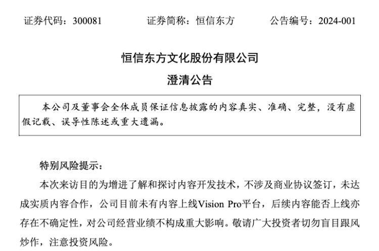 公司于2024年1月18日在公司微信公众号发布“快讯:苹果亚太区开发者关系团队造访!”该篇公众号文章系公司的常规公众号宣传报道,不涉及任何协议签订事宜,现就有关事项说明如下:此次到访公司的人员为苹果公司亚太大中华区开发者关系(DR)团队一行三人。来访目的为增进了解和探讨内容开发技术,本次来访未达成实质内容合作。公司仅为Vision Pro全球内容开发者之一,目前未有内容上线其平台。其平台在开发者合作层面为应用审核形式,后续公司开发的内容能否上线该平台亦存在不确定性,对公司经营业绩不构成重大影响。敬请广大投资者切勿盲目跟风炒作,注意投资风险。