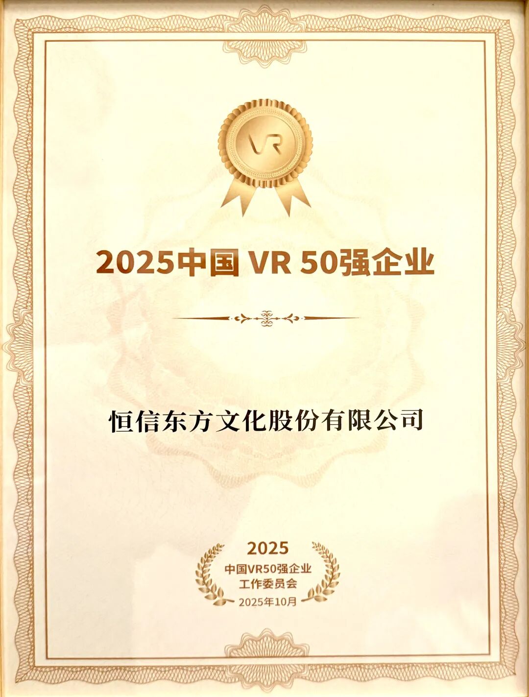 会上重磅揭晓了“2025中国VR50强企业”名单,恒信东方凭借多年在虚拟现实领域的技术积淀,从全国众多优秀企业中脱颖而出,五度蝉联“中国VR50强企业”,其核心竞争力与未来发展潜力获得高度认可。