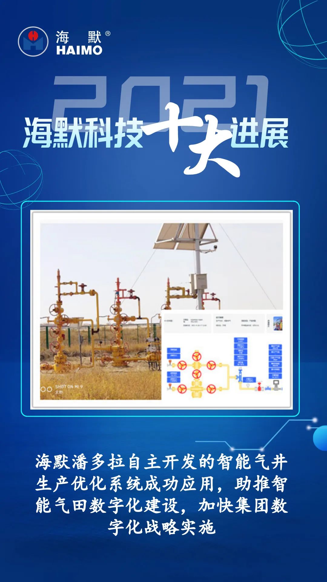 由海默科技子公司海默潘多拉数据科技公司自主开发的智能气井生产优化系统,是智能气田建设的核心,该系统为借助气井井口设备的感知能力和控制能力,结合业务模式、人工智能与专家知识,实现监测感知、优化预测、辅助决策及自动操控的大数据平台;2021年已在渤海钻探苏里格气田、华北油田苏里格气田进行了安装,对传统气井进行快速数字化改造和生产制度智能调配,优化后效果显著。该系统的开发和落地实验对海默科技响应国家“碳达峰”“碳中和”号召,落实公司数字化转型战略具有重大意义。