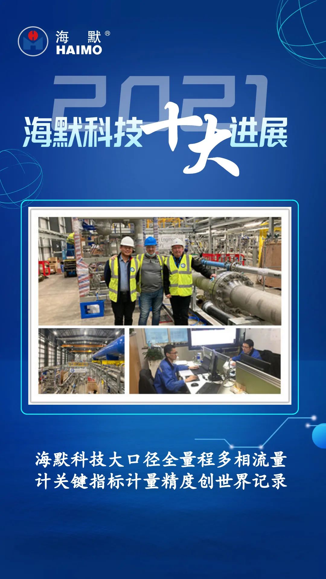 2021年11月,海默科技为法国道达尔公司海上大型凝析气田研制的,能够用于湿天然气计量的大口径(8英寸)全量程多相流量计,采用数字化远程测控的方式,成功通过国际权威检测机构英国国家工程实验室(NEL)的第三方测试认证,关键指标计量精度创新的世界纪录,突破了含水率精确计量误差随含气率升高而增大以及超高含气率湿天然气条件下含水率精确计量两大世界性难题!进一步巩固了海默科技在国际多相计量技术领域的领导地位,为公司向天然气勘探生产领域的业务拓展打开了新的增长点。