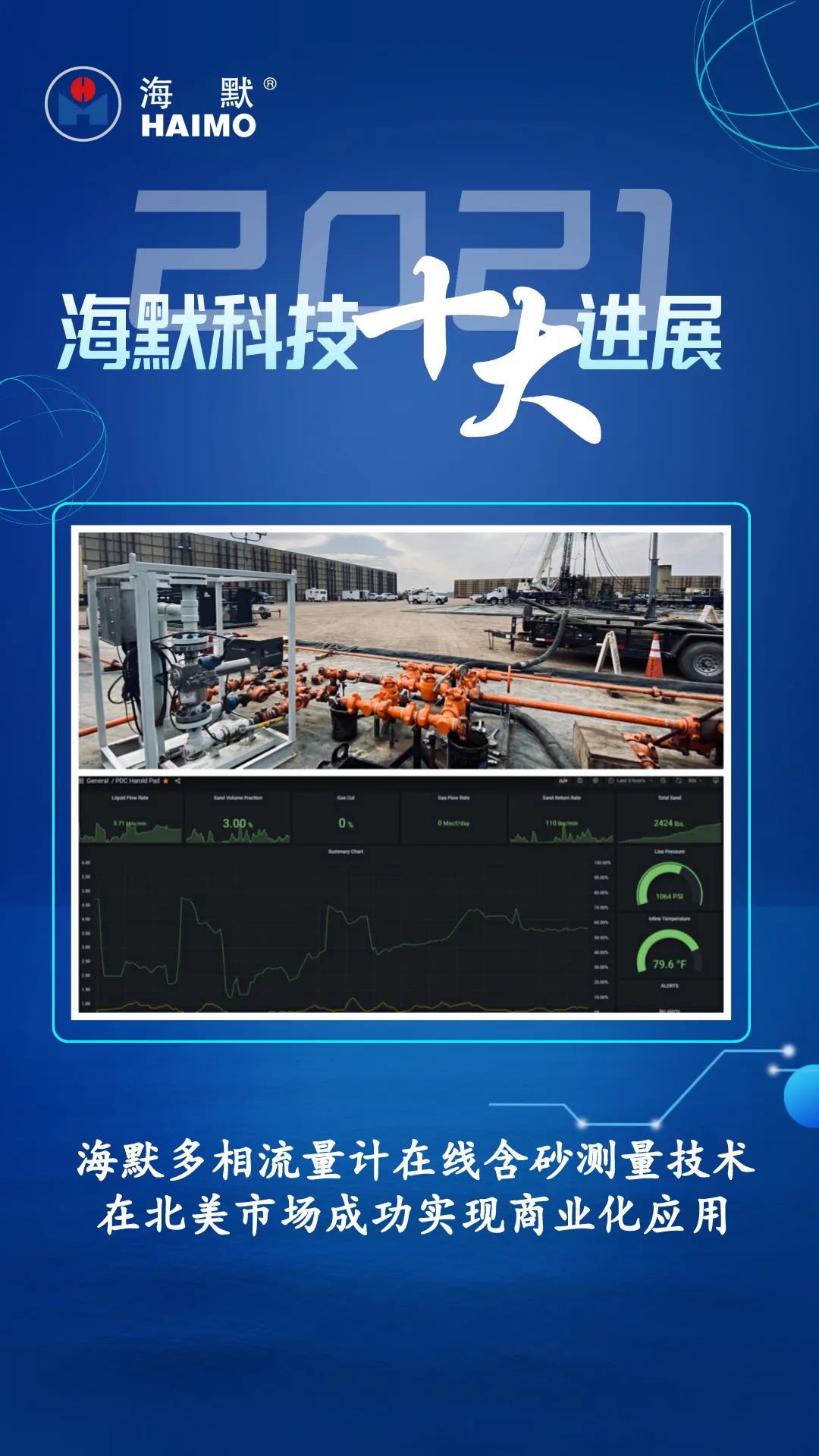 2021年,海默科技多相计量业务在北美市场取得突破性进展,在实现设备销售的同时,成功开展针对非常规油气井的多相计量移动测试和租赁服务,并将测试服务业务从生产作业成功延伸到完井钻塞、返排作业,全年营收超千万元,为海默科技未来多相计量业务的持续性增长提供强劲动力。
