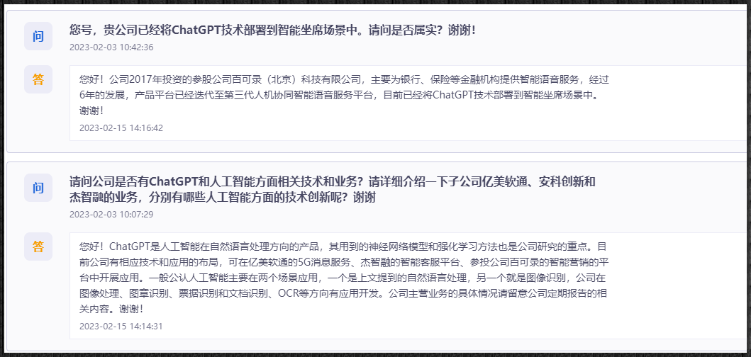 今年生成式AI概念中,银之杰再一次表示自己也有布局相关AI。在投资者互动平台中,银之杰表示,ChatGPT其用到的神经网络模型和强化学习方法也是公司研究的重点。目前公司有相应技术和应用的布局,可在亿美软通的5G消息服务、杰智融的智能客服平台、参投公司百可录的智能营销的平台中开展应用。同时,公司在图像处理、图章识别、票据识别和文档识别、OCR等方向有应用开发。