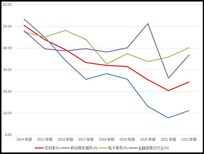 从财务数据看,2022年银之杰的营业收入和毛利率都有明显的下滑。在其三大业务板块中,营业收入占比最高的移动信息服务业务同比下降3.62%,电子商务服务业务同比下降了19.51%。更为严重的是,银之杰整体毛利率早已出现了大幅度下滑的趋势,从2014年的50.39%跌至2022年的24.31%。