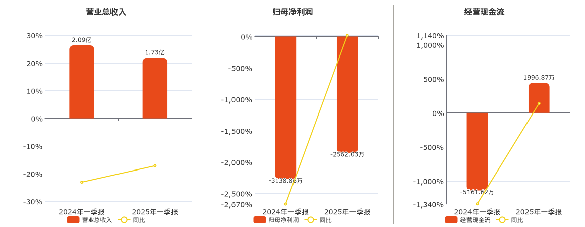 公司营业总收入为1.73亿元,较去年同报告期营业总收入减少3586.03万元,同比较去年同期下降17.14%。归母净利润为-2562.03万元。经营活动现金净流入为1996.87万元。